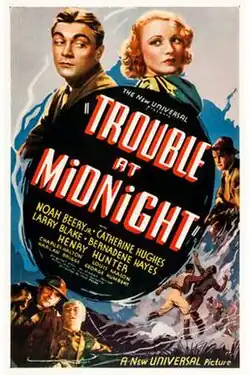 Trouble at Midnight is a 1937 American action film directed by Ford Beebe, written by Maurice Geraghty and Ford Beebe, and starring Noah Beery Jr., Kay Hughes, Larry J. Blake, Bernadene Hayes, Louis Mason and Earl Dwire. It was released on October 17, 1937, by Universal Pictures.[1][2][3]