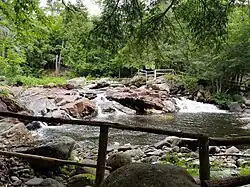 The river is most notable for running through the Natural Stone Bridge and Caves, a series of marble solutional caves which was formed by the river over the course of 14,000 years.[4] The river briefly becomes a subterranean river around the caves, resurfacing after 200 metres (660 ft) underground.[2]