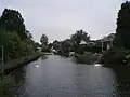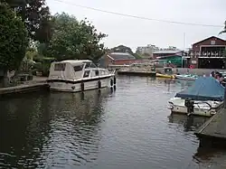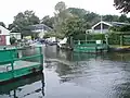 Trowlock Island contains 29 bungalows in plots as well as the Royal Canoe Club's clubhouse and gym.[2] Trowlock Island is about one-third of a mile (0.54 kilometres) long with a path down the middle and houses on either side.[2] Beyond the last house is a lightly wooded area with moorings on both the main river and the backwater.