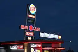 A truck stop (known as a service station in the United Kingdom,[1] a travel center by major chains in the United States and a roadhouse in rural Australia) is a commercial facility which provides refueling, rest (parking), and food and other services to motorists and truck drivers. Truck stops are usually located on or near a busy road.[2]