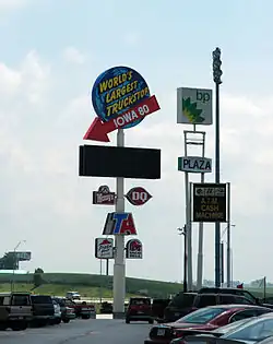 Smaller truck stops might consist of only a parking area, a fueling station, and perhaps a diner restaurant, or transport café (U.K. English).[3] Larger truck stops might have convenience stores of various sizes, showers, a small video arcade, and a TV/movie theater (usually just a projector with an attached DVD player). The largest truck stops, like Iowa 80 (the largest in the world),[4] might have several independent businesses operating under one roof, catering to a wide range of travelers' needs, and might have several major and minor fast-food chains operating a small food court. Larger truck stops also tend to have full-service maintenance facilities for heavy trucks, as well as vehicle wash services that can handle anything from passenger vehicles to large trucks. Some truck stops operate motels or have them adjacent. Most truck stops now offer separate fueling areas, often with dedicated entrances, for standard-sized passenger vehicles. The truck refueling area almost always offers dual pumps, one on each side, so large trucks can fill both tanks at once. (The second pump is referred to as the "slave pump" or "satellite pump.")