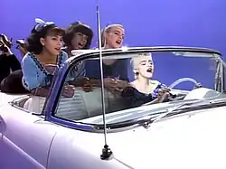 The official music video for "True Blue" was directed by James Foley, with whom Madonna had worked on "Live to Tell" and "Papa Don't Preach", and aired outside of the United States.[19][66] Crew included Robert Colesberry and David Massar in production, while Michael Ballhaus was in charge of cinematography.[67] For the visual, Madonna adopted a new leaner look; she hired a personal trainer to assist her in a "relentless exercise program".[8] The video shows her on an all-blue set, which includes a 1950s-style diner and a white Thunderbird convertible.[66] She dons a Marlene Stewart-created ensemble consisting of black ankle-length tights and blue poodle skirt.[68][66] Stylist Victor Vídal came up with the Elvis Presley-like hairdo the singer wears on the video; "I told her about this vision I had of her. I wanted to bleach her hair almost white and cut it short. She thought for a moment, said yes, picked up a magazine and never looked up until I was finished", Vídal recalled.[19][66][69] Actress Debi Mazar and dancer Erika Belle appear as the singer's girlfriends.[67][70] In one scene, Madonna sits on the Thunderbird and "campily" pretends to drive it, while Mazar and Belle dance behind her.[19]