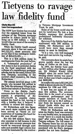 A New South Wales / Victoria case was the small legal firm Tietyens' practice in Albury on the New South Wales / Victoria border. Tietyens ran a contributory mortgage scheme backed by about 1,100 investors that furnished an investment of about $42 million in the Tally Ho Retirement Village in Burwood East in Melbourne.