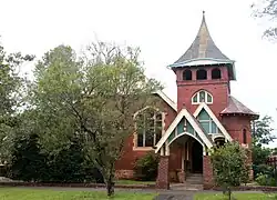 The main material used in the building is brick, relieved by stone-dressings introduced at openings, and with a high stone base course throughout. The brickwork is tuck-pointed, such parts usually plastered inside are tuck-pointed also. The elevation to Tryon Rd shows a fine gable with large triplet windows of leaded coloured glass in original designs, on the south side is the turret, containing a fine toned bell, and on the north side a large porch, each giving access to the main building. The interior of the church which is 1.8 metres (6 ft) by 10.8 metres (35.5 ft) is lit from the sides by eight windows, each of to lancets and circle grouped and filled with leaded coloured glass, similar to the front. The ceiling of the interior is formed by the line of collar ties in the centre and lower portions of principals at the sides - furring pieces being introduced to form a continuous clear line from end to end, relieved by moulded ribs and panelling. Delicate tie rods span the whole. The average height of the ceiling of the church is 7.6 metres (25 ft). That of the school hall is 18 ft; being treated somewhat in the manner as described of the church. A sloping floor is provided for the church - the average height of the interior walls from the floor being 5.0 metres (16.5 ft). Accommodation is provided for 350 persons with an additional 25 persons in the choir; which is semi-circular and raised in steps on a platform extending across the end of the church, one side of which is occupied by an ornamental rostrum. The seats throughout are of Queensland Kauri, having ornamental stall ends, slightly stained and varnished. A sliding door leading from the end of the church opens into the school block attached, which comprises a hall 13 metres (42 ft) by 10.2 metres (33.5 ft), with a raised platform, six class rooms, 1 square metre (10 sq ft); grouped about the same. The infant's room also being 6.9 metres (22.5 ft) by 6.2 metres (20.5 ft), and a sewing room 1 square metre (10 sq ft).[1]