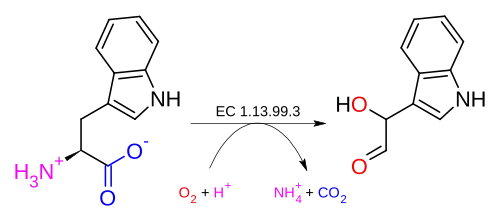 The systematic name of this enzyme class is L-tryptophan:oxygen 2'-oxidoreductase (side-chain-cleaving). Other names in common use include indole-3-alkane alpha-hydroxylase, tryptophan side-chain alpha,beta-oxidase, tryptophan side chain oxidase II, tryptophan side-chain oxidase, TSO, indolyl-3-alkan alpha-hydroxylase, tryptophan side chain oxidase type I, TSO I, TSO II, and tryptophan side chain oxidase.