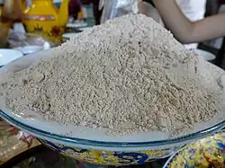 Tsampa or Tsamba (Tibetan: རྩམ་པ་, Wylie: rtsam pa; Chinese: 糌粑; pinyin: zānbā) is a Tibetan and Himalayan staple foodstuff; it is also prominent in parts of northern Nepal. It is a glutinous meal made from roasted flour, usually barley flour and sometimes also wheat flour and flour prepared from tree peony seeds. [1] It is usually mixed with the Tibetan butter tea. It is also eaten in Turkestan and Mongolia, where it is known as zamba.