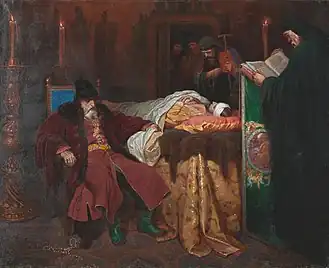 On 19 November 1581, the elder Ivan chastised the tsarevich's wife Yelena Sheremeteva for being unsuitably dressed, considering her advanced pregnancy, leading to an altercation between the two Ivans.[5] Ivan Ivanovich was killed by his father in a fit of rage,[6] with the argument ending after the elder Ivan fatally struck his son in the head with his pointed staff.[7] Yelena also suffered a miscarriage within hours of the incident.[5] The event is depicted in the famous painting by Ilya Repin, Ivan the Terrible and His Son Ivan.