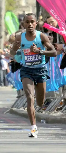 He remained in strong form the following year: he set a new personal best of 2:05:20 at the 2009 London Marathon, taking second place behind Wanjiru.[13] This elevated him into the top ten in the all-time marathon lists and made him the second fastest Ethiopian after world record holder Haile Gebrselassie.[14] Representing Ethiopia at the 2009 World Championships in Athletics, Kebede repeated the feat he had achieved a year earlier at the Olympics, overtaking Deriba Merga and taking the bronze medal as the fastest Ethiopian finisher in the World Championship marathon.[15] He improved his best further at the end of that year, winning the Fukuoka International Marathon for a second time. He finished the race in 2:05:18, a new course record and again setting the fastest time ever recorded for the marathon in Japan.[16]