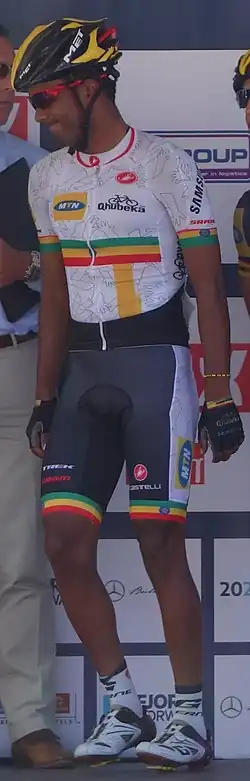 Tsgabu Gebremaryam Grmay (Tigrinya: ጽጋቡ ገብረማርያም ግርማይ; born 25 August 1991) is an Ethiopian retired professional road cyclist from Tigray, who last rode for UCI WorldTeam Team Jayco–AlUla.[6] He is a three time national road race champion, six time national time trial champion, and one time African time trial champion. Tsgabu became the first Ethiopian professional cyclist when he joined MTN–Qhubeka in 2012. In 2013 Tsgabu became the first Ethiopian to win an international cycling event when he won the fifth stage of the Tour de Taiwan. He made his UCI World Tour debut at the 2013 Giro di Lombardia.