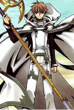 Syaoran is first seen as a child sleeping in water in an unknown area by sorcerer Fei-Wang Reed. He often connects with the other Syaoran, the protagonist of the manga, granting him aid in fights by connecting their bodies but also appears in visions where he threatens the teenager.[7][8] When Syaoran's body becomes that of a teenager, he is freed from his prison and is transported to Yuko Ichihara's shop.[9] He requests Yuko to help him visit the other Syaoran. As this happens, it is revealed this young man is a descendant from the sorcerer Clow Reed. Using his magic Syaoran was able to seal part of his "heart" within his clone, meant to be manipulated by Fei-Wang, allowing the clone to grow a personality.[10] Despite being imprisoned and sealed in slumber by Fei-Wang in his first appearances, Syaoran is sometimes able control his clone's body to assist him in his journey.[11][10] Once the clone betrays his friends, he joins the group of Kurogane, Fai, Mokona and Sakura as he wishes to recover something he lost,[12] later revealing he wished to find the original Sakura.[13] Despite feeling guilty for his clone's betrayal to the group, Syaoran befriends them as they do not find him responsible for it. He is a skilled fighter, having observed all of his clone's actions.[14] He is also able to perform elemental spell alongside and perform swordsmanship with his jian which he keeps merged within his body.[15]