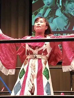 In June 2015, Fujimoto formed a tag team named Best Friends with JWP wrestler Arisa Nakajima,[181] with the two stating that their goal was to become the top tag team in all of joshi puroresu.[182] On July 29, Fujimoto celebrated her 32nd birthday with a gauntlet match, featuring 32 participants from both Ice Ribbon and outside of the promotion. She finished the match with eight wins, four losses and twenty time-limit draws. Afterwards, Manami Toyota, the final entrant in the match, endorsed Fujimoto as her successor, giving her the right to her Japanese Ocean finishing maneuvers and officially dubbing her the second generation "Flying Angel".[183][184] On August 20, Kuros produced their final independent event, before the stable's dissolution, where Fujimoto, Ohata and Shirai defeated Chikayo Nagashima, Kayoko Haruyama and Meiko Satomura in a six-woman tag team main event.[185] With Kuros done, Fujimoto found herself a new stable in Fairy Nipponbashi's Wonderful World Fairy Family (WWFF).[186] On October 17, Best Friends defeated another Ice Ribbon/JWP team of Aoi Kizuki and Kayoko Haruyama to win the International Ribbon Tag Team Championship.[187][188]