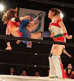 After submitting Maki Narumiya in a singles match on January 29, 2012, Fujimoto was granted a shot at her and Hikaru Shida's International Ribbon Tag Team Championship.[55] On February 1, Fujimoto main evented a Pro Wrestling Wave event, losing to Toshie Uematsu as part of her retirement tour.[56] On February 5, Fujimoto and Tsukushi, the team dubbed "Dropkickers",[57] defeated Shida and Narumiya to become the new International Ribbon Tag Team Champions, with Fujimoto pinning the ICE×60 Champion in the process.[58] Fujimoto and Tsukushi made their first title defense on March 20, defeating the team of Kurumi and Manami Toyota.[59][60] On March 24, Fujimoto made her debut for the Universal Woman's Pro Wrestling Reina promotion, defeating fellow Ice Ribbon worker Neko Nitta in the opening match of Reina.29.[61] On May 5, Fujimoto and Tsukushi lost the International Ribbon Tag Team Championship to the Happy Makers (Aoi Kizuki and Sayaka Obihiro) in the main event of Golden Ribbon 2012, ending their reign at 90 days.[62] Fujimoto wrestled the match against her doctor's orders, having dislocated her right elbow at a Pro Wrestling Wave event five days earlier.[63] On May 16, Fujimoto entered Pro Wrestling Wave's 2012 Catch the Wave tournament as a representative of the promotion's top villainous alliance Black Dahlia. In her opening round-robin match, Fujimoto, debuting a new black attire, defeated Black Dahlia's leader Misaki Ohata.[64] On May 25, Fujimoto defeated Aki Shizuku in the finals of the 2nd 19 O'Clock Girls ProWrestling Tournament to become the number one contender to the IW19 Championship.[65] On June 1, Fujimoto defeated Kurumi to win the IW19 Championship, becoming the first wrestler to have held every Ice Ribbon championship available.[66] On June 9, Fujimoto took part in the first event of Reina X World, the follow-up promotion to Universal Woman's Pro Wrestling Reina, during which she and Hikaru Shida defeated Aki Kanbayashi and Mia Yim in the finals of a four-team tournament to win the vacant Reina World Tag Team Championship.[67][68] Four days later, Fujimoto became a triple champion, when she won DDT Pro-Wrestling promotion's Ironman Heavymetalweight Championship. Taking advantage of a rule, where the champion could be pinned or submitted anytime and anywhere, Fujimoto pinned Hiroyo Matsumoto for the title at an Ice Ribbon event, following a six-woman tag team match, where she, Hamuko Hoshi and Hikaru Shida had defeated Matsumoto, Maki Narumiya and Sayaka Obihiro.[69] On June 16, Fujimoto made her first successful defense of the Ironman Heavymetalweight Championship, defeating DJ Nira, Masa Takanashi and Tomomitsu Matsunaga in a four-person battle royal at a DDT event, and afterwards also survived a backstage ambush from Matsunaga to leave the arena as the champion.[70][71] The following day, Fujimoto and Tsukushi defeated the Happy Makers at Ice Ribbon's sixth anniversary event to regain the International Ribbon Tag Team Championship, making Fujimoto a quadruple champion.[72] On June 23, Fujimoto lost the Ironman Heavymetalweight Championship to her tag team partner Tsukushi, who pinned her after a match, but shortly afterwards comically regained the title from one of Ice Ribbon's ring mats.[73] The following day, Fujimoto returned to DDT to defend the title in a ten-person, ten-minute battle royal. After losing the title to Hiroshi Fukuda, Fujimoto later regained the title from Tanomusaku Toba and ended the match as the reigning champion. However, immediately afterwards, Fujimoto was rolled up by Choun Shiryu, who then left the arena as the new champion.[74] When the round-robin portion of the 2012 Catch the Wave ended, Fujimoto finished with two wins, one draw and one loss, tied at the top of the Black Dahlia block.[75] On July 1, she was eliminated from the tournament, after losing a tiebreaker match against Yumi Ohka.[76] Afterwards, Fujimoto continued working regularly for Wave, however, no longer representing Black Dahlia.[77] The following week, as the reigning Reina World Tag Team Champions, Fujimoto and Shida traveled to Mexico to work for Consejo Mundial de Lucha Libre (CMLL).[78] Working just under their given names,[8] Tsukasa and Hikaru made their CMLL debuts on July 3 in Guadalajara, teaming with La Comandante in a six-woman tag team match, where they were defeated by Goya Kong, Luna Mágica and Silueta.[79][80][81] Three days later, Tsukasa and Hikaru teamed with Lady Apache in Mexico City in another six-woman tag team match, where they were defeated by Dark Angel, Estrellita and Marcela.[82] Tsukasa's and Hikaru's tour of CMLL concluded on June 8 in Mexico City, when they teamed with Princesa Sujei to defeat Dalys la Caribeña, Lluvia and Luna Mágica in a six-woman tag team match.[83] Upon her return to Japan, Fujimoto and Tsukushi lost the International Ribbon Tag Team Championship to Miyako Matsumoto and Neko Nitta on July 15.[84] On August 10, Fujimoto lost the IW19 Championship to Otera Pro representative Aki Shizuku in her first defense.[85]