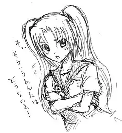 Comiket organizer Koichi Ichikawa has described Lum from Urusei Yatsura as being both the source of moe and the first tsundere;[11] figurine sculptor Bome has also cited Lum as an inspiration for his designs.[12] Manga critic Jason Thompson named Madoka Ayukawa of the 1980s series Kimagure Orange Road as the root of the tsundere archetype.[13] Other anime and manga featuring tsundere include Love Hina, Neon Genesis Evangelion,[14] and Bakemonogatari,[15] among many others. Some voice actors have garnered a reputation for voicing tsundere characters such as Rie Kugimiya who voices Louise in The Familiar of Zero and Nagi in Hayate the Combat Butler,[16][17] and Ayana Taketatsu as Kirino Kosaka in Oreimo.[18] In Excel Saga volume 15, author Rikdo Koshi defines tsundere as "hard on the outside, soft on the inside" and associates it with character Misaki Matsuya.[6]