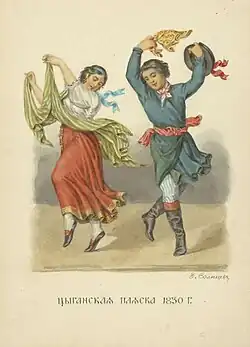 Tsyganochka (Russian: Цыганочка, "Gypsy Girl") is a Russian folk dance stylized under the Russian Roma tunes.[1] The music is in minor tonality, unusual in Russian folk dance, in 4/4 time signature. [1]
