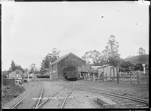 The railway, some 1.5 mi (2.4 km) north of the original Tuakau village,[7] opened as part of the Auckland and Mercer Railway on 20 May 1875, built by Brogden & Co,[8] when it was extended from Penrose.[9] Trains had been able to reach Tuakau since at least February 1875.[10] Tuakau wasn't shown in the 1875 timetable,[11] but was in that of 1876.[12] There was a stationmaster by June 1876[13] and fencing of the stationmaster's house was mentioned in September 1878.[14]