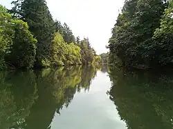 Shortly thereafter, the river passes Browns Ferry Park, which is on the river's right, and then Canal Acres Park, on the left. At the east end of the park, Saum Creek enters from the right, and the Oswego Canal, which carries water from the Tualatin River to Oswego Lake in Lake Oswego, is on the left. Beyond the canal entrance, the river passes River Run Park, which is on the left.[11] Soon Athey Creek enters from the right and Pecan Creek from the left before the river passes under Southwest Stafford Road near the unincorporated area of Wankers Corner and flows past the unincorporated community of Shadowood. In its final 5 miles (8 km), the river receives Wilson Creek from the right, passes under Interstate 205 and then under Southwest Borland Road, and receives Fields Creek from the left. It flows by Swift Shore Park, which is on the left, under Southwest Pete's Mountain Road, by Willamette Park, also on the left, and enters the Willamette River at West Linn, about 28 miles (45 km) from the larger river's confluence with the Columbia River. The mouth is five miles away from oswego lake. the closest tributary to the mouth is the fanno creek. [7][8]