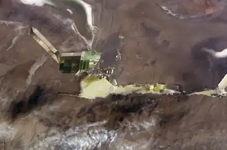 ![]() Tuanjie Lake in 2003, surrounded with salt pans. The town of Qarhan and Lake Dabusun are visible to the NW. | |