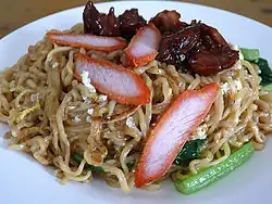 Tuaran mee (Traditional Chinese: 鬥亞蘭面; Hakka: Diu ah lan men), which literally translates as 'Tuaran noodles', is a noodle dish created by the Hakka Chinese community of Tuaran. The noodles are made from a batter consisting of egg yolk and flour. They are fried for five to ten minutes in high heat, causing the bottom part of the noodles to become crunchy. Local vegetables are added during frying. Before Tuaran mee is served, it is usually garnished with slices of sweetened Chinese roast pork (Traditional Chinese: 叉燒; Hakka: cha sau) and fried egg rolls (Traditional Chinese: 春捲; Hakka: chun kien).