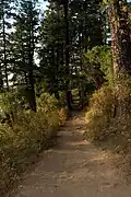 The primary attraction of the park is the interpretive trail loop, that can get somewhat crowded during the peak seasons, which is from May through October.[9] The compacted dirt trail is narrow but has been rated as "easy" in difficulty,[7] being mostly flat for the first 1-mile (1.6 km) with the main obstacles being rocks and tree roots; the trail is not considered wheelchair or stroller accessible.[9] The elevation gain for the hike is 291 feet (89 m) and on average the trail takes about 52 minutes to complete.[9] The self-guided interpretive trail takes visitors passed scenic viewpoints and historical sites and is demarcated by wood trail markers that are 8 inches (200 mm) by 10 inches (250 mm) in size and posted 8 feet (2.4 m) above ground; at the trail entrance is a map and informational brochure that corresponds to these markers.[7] In addition to the main trail loop are side trails that branch off the main trail, allowing visitors to bisect the loop or go up to the summit of Tubbs Hill.[6]