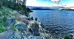 The park features beaches that provide access to the lake, a 2.2-mile (3.5 km) interpretive trail and several areas with sweeping views of Lake Coeur d'Alene.[6] Activities such as climbing, cliff jumping, kayaking, fishing, sun bathing, bird watching and flower viewing are also popular activities to do in and around the park.[7][8]