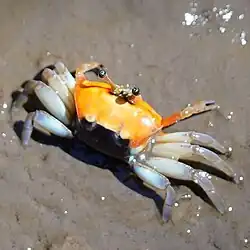 Tubuca coarctata is a species of fiddler crab found in the western Pacific ocean, including Japan, Taiwan, the Philippines, Indonesia, New Guinea and Australia (in Queensland and the Northern Territory).[1][2][3] The common name of these crabs is either the compressed fiddler crab,[4] or the orange-clawed fiddler crab,[5] (although this name is also used for Gelasimus vomeris). They are found on tidal mud flats adjacent mangroves and muddy tidal creek and river banks.[5]