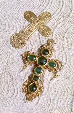 Tucker's Cross is an emerald-studded (7 emeralds total) 22-karat gold cross discovered by Bermudian marine explorer Teddy Tucker in 1955. Its origin is believed to be the San Pedro, a Spanish galleon that wrecked in 1594.[1]San Pedro captained by Pedro Nunez de Bohorquez.The Nunez San Pedro was under the protection of an armada when it left Spain in 1594 to Portobelo, Panama. Following a stop planned in Cartegena, Colombia for the loading of precious goods, the armada started on their return journey, a route around Havana and onward to Azores in the Atlantic. Whilst the exact cause of the disaster is unknown, it is possible that the ship was taken slightly off course, resulting in its wrecking on the Bermudian reef. As the San Pedro was slightly ahead of the armada, there were no witnesses to the tragedy.