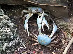 Tuerkayana celeste, known as the Christmas Island blue crab is a species of crab in the family Gecarcinidae. The species is only found near freshwater on Christmas Island. The species was first recorded in 1900 but only in 2012 was it found to be a separate species from the Tuerkayana hirtipes. The species was used for food in the 1950s but was subsequently protected in 1980.[1][2][3][4]