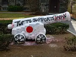 On April 7, 2024, Tufts students joined other campuses across the United States in protests and setting up encampments in protest against the Gaza war.[54][55] The protestors demands included disclosure of University investments and divestment from Israel.[56] The encampment ended after a month with Tufts Students for Justice in Palestine rejecting what it called "a bad-faith deal" offered by the administration.[57] More than 250 members of the graduating class threatened to boycott commencement and called for an end to "Tuft University’s financial complicity in the ongoing devastation of Gaza".[58]