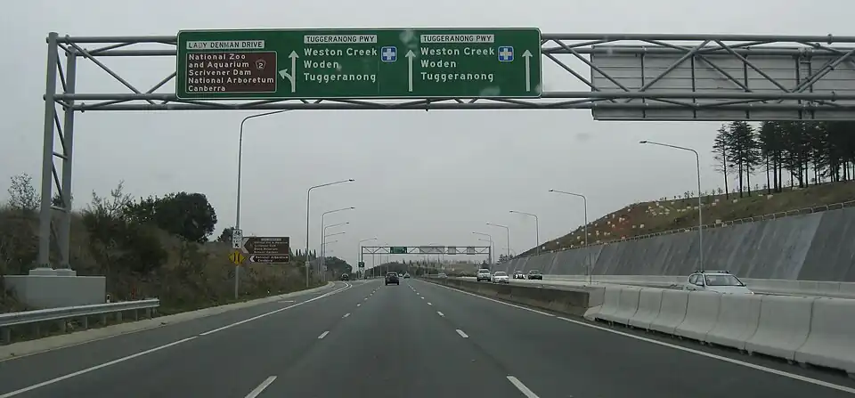 Tuggeranong Parkway is an 11-kilometre-long (6.8 mi) major highway in Canberra, Australia. Often referred to as "The Parkway" by locals, Tuggeranong Parkway links Civic to the southern Canberra metro district of Tuggeranong, and is a bypass road to the Woden Valley-Weston Creek district of Canberra. It also links to the Glenloch Interchange, where roads such as Caswell Drive connect to Belconnen.