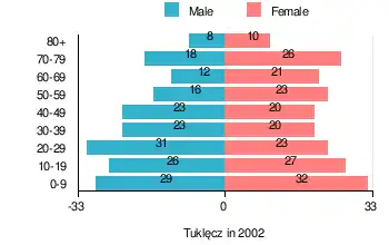 In 2002, there were 388 people residing in Tuklęcz village, of whom 47.9% were male and 52.1% were female. In the village, age groups were well distributed, with 26.8% under the age of 18, 33% from 18 to 44, 17.5% from 45 to 64, and 22.7% who were 65 years of age or older.[1]