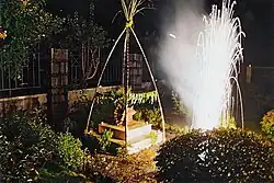 The wedding ceremony of Tulasi to Vishnu/Krishna resembles the traditional Hindu wedding.[4][5] The wedding is conducted at homes and in temples where a fast is observed until evening, when the ceremony begins. A mandapam (wedding booth) is built around the courtyard of the house where the tulasi plant is usually planted in centre of the courtyard in a brick plaster called the Tulasi Vrindavana. It is believed that the soul of Vrinda resides in the plant at night and leaves in the morning.[6] The bride Tulasi is adorned with a sari and ornaments including earrings and necklaces. A human paper face with a bindi and nose-ring may be attached to Tulasi. The groom is a brass image or picture of Vishnu, Krishna, Balarama, or more frequently the shaligrama stone - the symbol of Vishnu. The image is clothed in a dhoti. Both Vishnu and Tulasi are bathed and decorated with flowers and garlands before the wedding. The couple is linked with a cotton thread (mala) in the ceremony.[5]