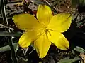 The plant blooms with a single flower. The six petals elongated or oblongate, diamond-shaped, pointed to pointed, periosteums are between 2 and 3.5 centimeters long and 0.5 to 2 centimeters wide. They are yellow and on the outside greenish-purple or pink. The six stamens are 0.4 to 0.5 times as long as the perine leaves, bald and narrowed from the ground. The pollen measures 38.4 to 40.3 x 53.7 to 67.2 microns. Three apertures (germ openings) are located on the pollen granules. The exine is 1.9 microns thick. The stylus is very short.