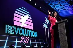 Gabbard launched her 2020 presidential campaign running on an anti-interventionist and populist platform, but dropped out and endorsed Joe Biden in March 2020. Previously, she also served as vice-chair of the Democratic National Committee (DNC) from 2013 to 2016 but resigned to endorse Bernie Sanders for the 2016 Democratic presidential nomination. After her departure from Congress in 2021, Gabbard took more mainstream positions on issues such as transgender rights, border security, and foreign policy. In 2022, she spoke at the conservative CPAC conference and left the Democratic Party.