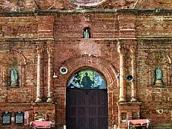 The church building is made entirely of ornately designed red bricks in its façade and its interior walls.[4] A closer look at the brick façade shows numbers and dates for the correct sequence of the bricks in Forto's design.[3] The façade is flanked by two pseudo-Corinthian columns and niches, one located above the entrance and the two remaining larger niches on each side of the columns.[3] The church's circular pediment is unique relative to all other churches built during the Spanish Era.[3]
