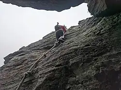 In 2009, a new rope was installed at the top of the Chimney Trail. As of December 2009, it was a purple synthetic rope tied off to the second of several iron rungs at the top. The trail itself is still unmaintained and hard to follow above the cliff wall and presumably the same below.