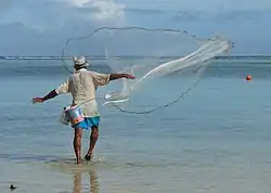 Marine preserves began to be fully enforced in 2001.[9] In 2005, the interagency Guam Coral Reef Monitoring Group began monitoring Tumon Bay.[10] The Tumon Bay preserve comprises 9.2% of all marine protected area on Guam. In a 2009 study, 18% of the preserve was coral, 10% was seaweed, and 1% was seagrasses.[1] Within the Tumon preserve, all species of fish may be caught by hook-and-line. Juvenile (4 inches or less) Goatfish and Jack may additionally be caught from the shore with cast net. Rabbitfish and Convict Tang may be caught from the shore or reef line with cast net. Bottom fishing is allowed from the 100 foot contour outwards. Trolling is allowed from the reef margin seaward for pelagic fish only.[11] Arrests for illegal fishing in Tumon continue to be made.[12] The Guam Long-Term Coral Reef Monitoring Program began partial monitoring of Tumon Bay Marine Preserve in June 2009 and began full data monitoring in 2010. It was determined that the southern and northern halves of the study site had very different benthic communities and the site was redrawn to get adequate monitoring of both communities.[13] A 2010 study found that the establishment of Guam's marine preserves had doubled the death rate by drowning of Chamorro fisherman, with the hypothesis being that they were pushed into more hazardous areas.[14]