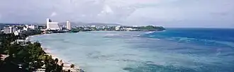 Tumon Bay is a bay in the United States territory of Guam, opening to the Philippine Sea. It is bounded to the north by Two Lovers Point and to the south by Ypao Point. The entirety of the bay falls within the Tumon Bay Marine Preserve, also known as the Tumon Bay Marine Preserve Area (MPA) and Tumon Preserve, one of five marine preserves on Guam. The Preserve measures 4.54 square kilometers and is roughly two miles long. The platform of the fringing reef that separates the open ocean from the lagoon is up to 1,450 feet (440 m) wide.[1] and up to one mile from the shore.[2] The bay is located off of the Tumon area, the tourist center of the island, in the village of Tamuning. The bay is extensively utilized for recreation and fishing.