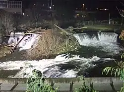 Olympia Light and Power Company constructed a dam and a hydroelectric power plant at the falls in 1890, a decade before the Snoqualmie Falls powerplant outside Seattle.[6]: 23 The plant powered an Olympia–Tumwater streetcar, among other things.[7][8] A dam at 82 feet (25 m) above sea level created a head for the powerhouse and still stands on the Deschutes River.[2]