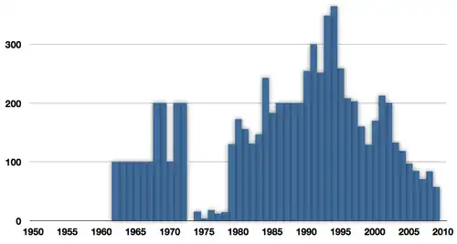 The main reason that the aquaculture of Anguillid eels has become more popular in recent times is that the wild seed supply cannot support the demand of the consumer. Because of declining catches of both the European and Japanese glass eels, seed from the short-finned eels is at a commercial premium.[8] The increasing pressure on eels has led to reduced recruitment of juveniles of anguilid species which limits the industry and potentially leads to ecological impacts.[9] Supply of seed to aquaculture operations of these eels relies solely on wild stocks of glass eels. These stocks are declining and there is now pressure being placed on the development of intensive eel culture technology. Anguillid eels cannot be reared from eggs in a culture setting, it is the glass eels caught from wild stock that are reared.