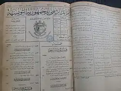 The supreme legal norm of the country, composed of 78 articles, it constitutes the second Constitution in the modern history of the country.[3] The first was adopted in 1861, making Tunisia the first Arab state to adopt such a text, after the proclamation of the Fundamental Pact of 1857.[4] Legal foundation of the republican regime, it is marked by the affirmation of a strong executive. The Constitutional Council verifies a posteriori the conformity of laws with the Constitution when it is referred to it.