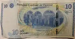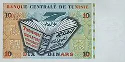 On 3 November 1958, banknotes were introduced by the Central Bank of Tunisia in denominations of 1⁄2, 1 and 5 dinars.[4] The designs of these denominations were changed with a series of notes dated 1-6-1965, but issued on 3 March 1966. A 10-dinar note dated 1-6-1969 was issued on 2 January 1970. The last 1⁄2-dinar notes were dated 1973-10-15 whilst the last 1-dinar notes were dated 1980-10-15. 20-dinar notes dated 1980-10-15 were introduced on 26 December 1984. 30-dinar notes were issued between 1997 and 2011. 50-dinar notes dated 2008 were issued on 25 July 2009.[5] On 8 November 2005, an updated version of the frequently used 10-dinar note was issued.