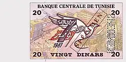 20 dinars | Purple | Kheireddine Et-Tounsi | Motif commemorating the overthrow of Habib Bourguiba on 7 November 1987 |