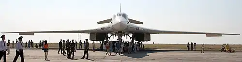 The Tupolev Tu-160 (Russian: Туполев Ту-160 «Белый лебедь», romanized: Bely Lebed, lit. 'White Swan';[1] NATO reporting name: Blackjack) is a supersonic, variable-sweep wing nuclear-capable heavy strategic bomber and airborne missile platform designed by the Tupolev Design Bureau in the Soviet Union in the 1970s. The aircraft is large, rather longer than a Boeing B-52 Stratofortress at 54 m, with wingspan 56 m when spread, 36 m when swept back. The Tu-160 is operated by the Long Range Aviation branch of the Russian Aerospace Forces.[2]
