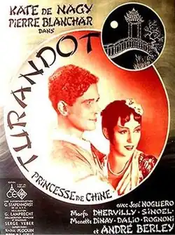 Turandot, Princess of China (French: Turandot, princesse de Chine) is a 1935 comedy film directed by Gerhard Lamprecht and Serge Véber and starring Käthe von Nagy, Pierre Blanchar and Marcel Dalio. It is the French language version of the German film Princess Turandot.[1] Such multi-language versions were common during the first decade of sound.