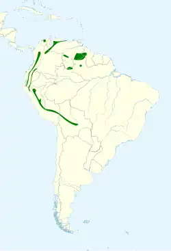 It is found in Bolivia, Brazil, Colombia, Ecuador, Guyana, Peru, and Venezuela. Its natural habitat is subtropical or tropical moist montane forests.