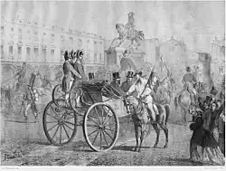 In the evening, several gatherings formed around the city which insulted the carabinieri and public security officers present in the streets and reached Piazza San Carlo.[29] In the square, defending the police headquarters, were the carabinieri, infantry and public security officers, but without coordination between the different corporations. The square was crowded, however, and carriages passed regularly. The presence of the carabinieri was the cause of insults, as they were accused of firing on helpless citizens the day before; the commanders' proposal to withdraw the carabinieri from the square to avoid incidents was not approved by the police commissioner.[30]