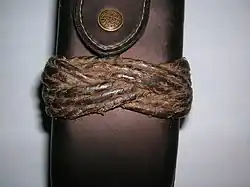 A Turk's head knot, sometimes known as a sailor's knot, is a decorative knot with a variable number of interwoven strands forming a closed loop. The name refers to a general family of knots, not an individual knot. While this knot is typically made around a cylinder, it can also be formed into a flat, mat-like shape. Some variants can be arranged into a roughly spherical shape, akin to a monkey's fist knot.[1]