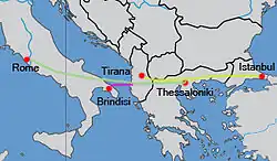 An official from Greek Ministry of National Defence said the plane had entered Greek air space at 14:58 (UTC).[4] The pilots transmitted the hijack squawk code twice at 14:55 (UTC), while the aircraft was cruising about 25 kilometres (15 mi) north of Thessaloniki. Italian Interior Minister Giuliano Amato reported that the hijacker slipped into the cockpit with a package which could have been a bomb when flight attendants opened the cockpit door, and the pilots acted according to the international rules in the matter and did what the hijacker wanted.[5][6] The flight's captain reported in Istanbul that "while the chief stewardess entered the cockpit to ask if we needed anything, the terrorist entered by force. I tried to push him out but he was a big man and I failed to stop him". The captain went on to say that the hijacker said he had three friends and they had explosives.[7] He wanted to go Rome to speak with the Pope,[6] and Italian Minister of the Interior Giuliano Amato reported that, the hijacker added there are other hijackers on another unspecified plane, "would blow that plane up if the missive didn't get to the pope".[5] Four Greek F-16 fighter jets took off and accompanied the plane until it left Greek airspace. Once in Italian airspace, two Italian F-16s intercepted, escorted, and forced it to land in Brindisi Airport in Brindisi.[8] The airline spokesman said that Greek officials had alerted their Italian counterparts about the hijacking incident.[9]
