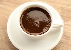 Turkish coffee is very finely ground coffee brewed by boiling. Any coffee bean may be used; arabica varieties are considered best, but robusta or a blend is also used.[2] The coffee grounds are left in the coffee when served.[3][4] The coffee may be ground at home in a manual grinder made for the very fine grind, ground to order by coffee merchants in most parts of the world, or bought ready-ground from many shops.