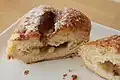 There are food products that look similar to Turnovers, but are not made from Pastry dough. In Italy, the Calzone, which originated in Naples in the 18th century, is essentially a folded pizza. Traditionally made from salted bread dough, baked in an oven and is stuffed with salami, ham or vegetables, mozzarella, ricotta and Parmesan or pecorino cheese, as well as an egg.[54] The Panzerotti, which originated in the Apulia region, are a smaller hand-held version of a Calzone, and are classically filled with tomato and mozzarella, though other typical Italian fillings are common such as cured meats, varied cheeses and greens such as the Pugliese favourite: cime di rapa. Panzerotti are deep-fried instead of being baked.[55][56][57][58][59] Another folded and stuffed bread product is Scaccia, a Sicilian stuffed flatbread. Bierock are a yeast dough pocket sandwich with savory filling that originated in Eastern Europe, with the yeast dough folded over the fillings.[60][61][62]